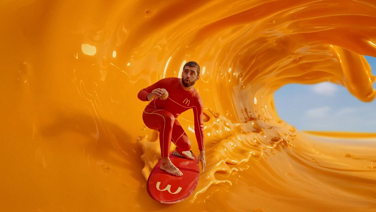 a campanha mistura efeitos práticos com pós-produção pra apresentar a família completa de Cheddar do McDonald's, com Pedro Scooby surfando essa explosão de textura e movimento.